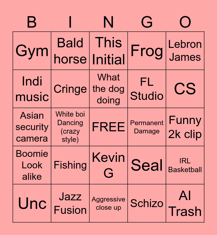 This bingo card has a free space and 24 words: Unc, Fishing, What the dog doing, Schizo, Lebron James, Gym, Bald horse, This Initial, Permanent Damage, Funny 2k clip, Asian security camera, Cringe, Seal, IRL Basketball, Indi music, Jazz Fusion, Aggressive close up, Frog, CS, Boomie Look alike, White boi Dancing (crazy style), Kevin G, FL Studio and AI Trash.