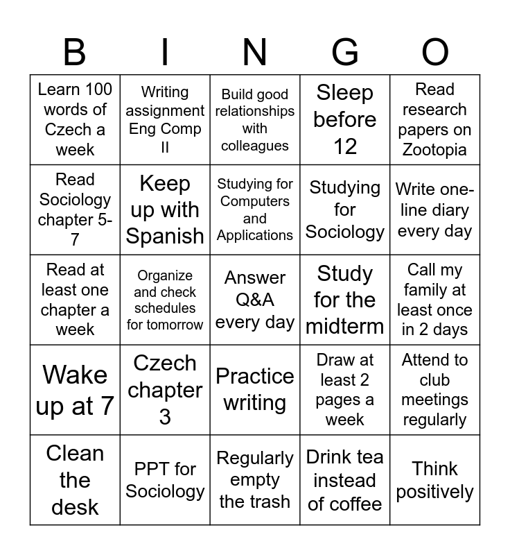 This bingo card has a free space and 24 words: Czech chapter 3, PPT for Sociology, Studying for Computers and Applications, Clean the desk, Read research papers on Zootopia, Learn 100 words of Czech a week, Read Sociology chapter 5-7, Writing assignment Eng Comp II, Study for the midterm, Practice writing, Studying for Sociology, Read at least one chapter a week, Draw at least 2 pages a week, Attend to club meetings regularly, Keep up with Spanish, Drink tea instead of coffee, Call my family at least once in 2 days, Build good relationships with colleagues, Write one-line diary every day, Organize and check schedules for tomorrow, Think positively, Wake up at 7, Sleep before 12 and Regularly empty the trash.
