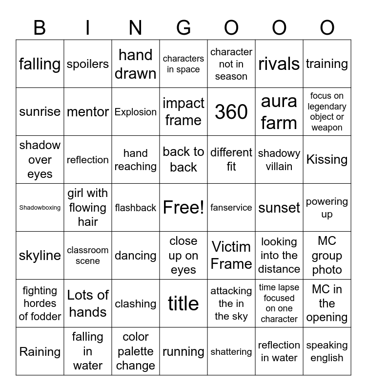 This bingo card has a free space and 48 words: attacking the in the sky, aura farm, running, girl with flowing hair, hand reaching, powering up, spoilers, falling in water, rivals, close up on eyes, training, characters in space, shadowy villain, different fit, fighting hordes of fodder, sunset, sunrise, focus on legendary object or weapon, time lapse focused on one character, character not in season, 360, flashback, falling, mentor, MC in the opening, Explosion, Kissing, Raining, back to back, reflection, reflection in water, fanservice, MC group photo, Lots of hands, Shadowboxing, Victim Frame, looking into the distance, shadow over eyes, dancing, clashing, skyline, speaking english, hand drawn, color palette change, impact frame, title, classroom scene and shattering.