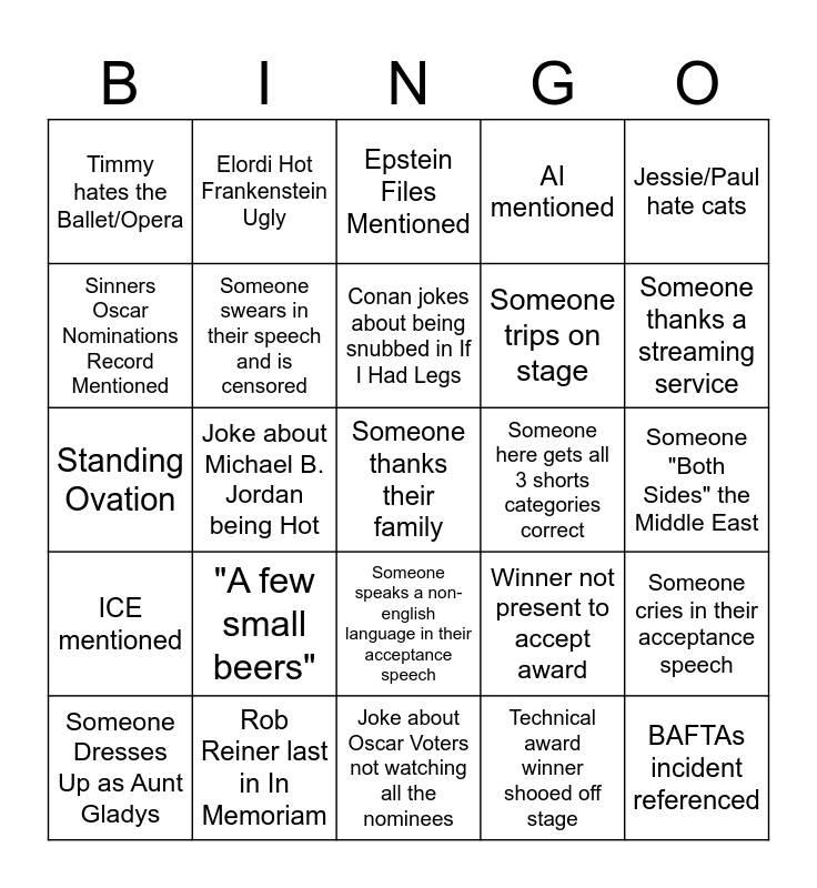 This bingo card has a free space and 24 words: "A few small beers", Rob Reiner last in In Memoriam, Conan jokes about being snubbed in If I Had Legs, Someone Dresses Up as Aunt Gladys, Jessie/Paul hate cats, Timmy hates the Ballet/Opera, Sinners Oscar Nominations Record Mentioned, Elordi Hot Frankenstein Ugly, Someone here gets all 3 shorts categories correct, Someone speaks a non-english language in their acceptance speech, Someone trips on stage, Standing Ovation, Winner not present to accept award, Someone cries in their acceptance speech, Someone swears in their speech and is censored, Technical award winner shooed off stage, Someone "Both Sides" the Middle East, Epstein Files Mentioned, Someone thanks a streaming service, Joke about Michael B. Jordan being Hot, BAFTAs incident referenced, ICE mentioned, AI mentioned and Joke about Oscar Voters not watching all the nominees.