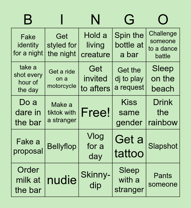 This bingo card has a free space and 26 words: Kiss a stranger, Bellyflop, Skinny-dip, Sleep with a stranger, Sleep on the beach, Fake identity for a night, Get styled for the night, Hold a living creature, Get the dj to play a request, Slapshot, Do a dare in the bar, Make a tiktok with a stranger, Get a tattoo, Pants someone, Fake a proposal, Get a free drink from a stranger, Get invited to afters, Kiss same gender, Challenge someone to a dance battle, Order milk at the bar, Get a ride on a motorcycle, Vlog for a day, Spin the bottle at a bar, Drink the rainbow, take a shot every hour of the day and nudie.