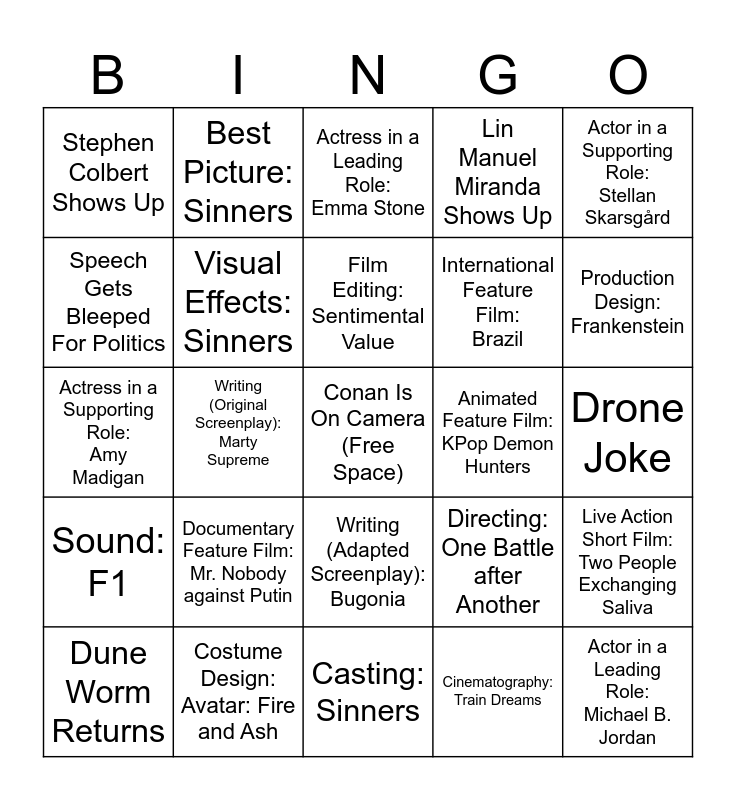 This bingo card has a free space and 24 words: Documentary Feature Film: Mr. Nobody against Putin, Costume Design: Avatar: Fire and Ash, Film Editing: Sentimental Value, Dune Worm Returns, Actor in a Supporting Role: Stellan Skarsgård, Stephen Colbert Shows Up, Speech Gets Bleeped For Politics, Best Picture: Sinners, Animated Feature Film: KPop Demon Hunters, Writing (Adapted Screenplay): Bugonia, International Feature Film: Brazil, Actress in a Supporting Role: Amy Madigan, Directing: One Battle after Another, Live Action Short Film: Two People Exchanging Saliva, Visual Effects: Sinners, Cinematography: Train Dreams, Drone Joke, Actress in a Leading Role: Emma Stone, Production Design: Frankenstein, Writing (Original Screenplay): Marty Supreme, Actor in a Leading Role: Michael B. Jordan, Sound: F1, Lin Manuel Miranda Shows Up and Casting: Sinners.