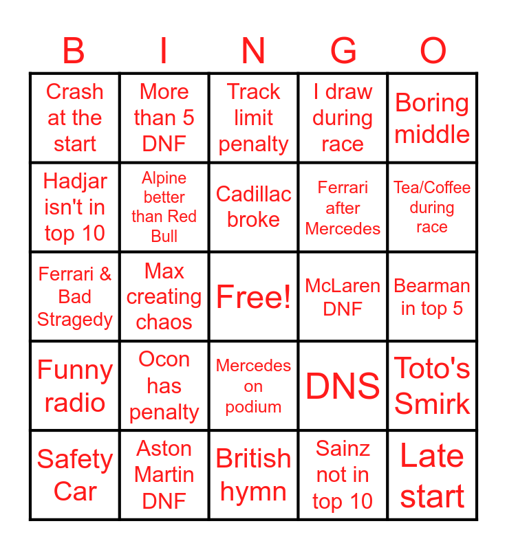 This bingo card has a free space and 24 words: Ocon has penalty, Aston Martin DNF, Cadillac broke, Safety Car, Boring middle, Crash at the start, Hadjar isn't in top 10, More than 5 DNF, McLaren DNF, Mercedes on podium, Ferrari after Mercedes, Ferrari & Bad Stragedy, DNS, Toto's Smirk, Alpine better than Red Bull, Sainz not in top 10, Bearman in top 5, Track limit penalty, Tea/Coffee during race, Max creating chaos, Late start, Funny radio, I draw during race and British hymn.