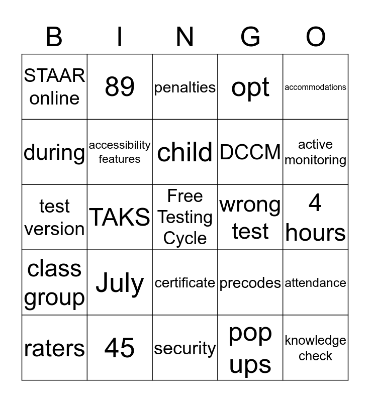 This bingo card has a free space and 24 words: July, 45, child, raters, accommodations, STAAR online, during, 89, wrong test, certificate, DCCM, test version, precodes, attendance, accessibility features, pop ups, 4 hours, penalties, active monitoring, TAKS, knowledge check, class group, opt and security.