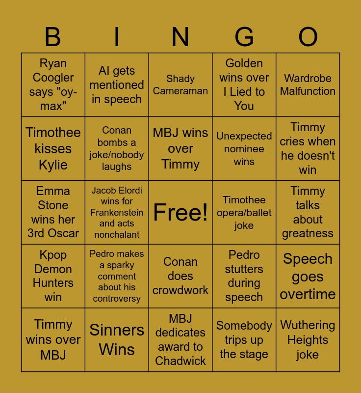 This bingo card has a free space and 24 words: Pedro makes a sparky comment about his controversy, Sinners Wins, MBJ wins over Timmy, Timmy wins over MBJ, Wardrobe Malfunction, Ryan Coogler says "oy-max", Timothee kisses Kylie, AI gets mentioned in speech, Timothee opera/ballet joke, Conan does crowdwork, Unexpected nominee wins, Emma Stone wins her 3rd Oscar, Pedro stutters during speech, Speech goes overtime, Conan bombs a joke/nobody laughs, Somebody trips up the stage, Timmy talks about greatness, Shady Cameraman, Timmy cries when he doesn't win, Jacob Elordi wins for Frankenstein and acts nonchalant, Wuthering Heights joke, Kpop Demon Hunters win, Golden wins over I Lied to You and MBJ dedicates award to Chadwick.