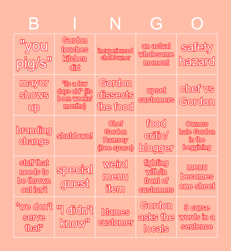 This bingo card has a free space and 100 words: Gordon's stamp of approval, "Bland", Owners hate Gordon in the beggining, Gordon goes outside and talks to camera, Ugly Renovation, Crying and hugging, Dry/Cold food, Raw/Moldy food, Dirty kitchen, Frozen Fresh Food, "You don't care", Nice waiters/ waitresses, Crappy decor, "I didn't know", slow service speed, family feud, upset customers, debt, giving up, Gordon becomes therapist / life coach, big menu, staff walking out, smoking / drinking on the job, Gordon asks staff to touch/ taste food, Thirsting for Gordon, food critic/ blogger, safety hazard, fighting with/in front of customers, denial, workers hate boss, shutdown!, "you pig/s", clueless owners, owner with big ego, Gordon asks the locals, Gordon dissects the food, menu becomes one sheet, horrendous food, Gordon shows the owners customer/staff complaints, premade food, "we cook it and freeze it", "Our food is great", branding change, relaunch problems, chef vs Gordon, inexperienced chef /owner, "we cleaned last week", Gordon vomits/ spits out food, Lazy/crappy worker/s, blames customer, chef Mike, chef cant cook, micromanagement, arrogant owner/chef, flies/rats, lost passion, on the phone while working, can't take constructive criticism, sound effects, an actual wholesome moment, dysfunctional family business, "something needs to change", someone gets fired, "oh my god", owner passing blame, boss hates workers, salty, "this is crazy", unavailable menu items, claims food is supposed to be like that (its not), Gordon roasts the food, special guest, funny moment, incompetent staff, ungrateful after renovation, breakdown, "dreadful", mayor shows up, "I wouldn't feed this to my dog", 80's decor, Gordon shouting, 3 curse words in a sentence, defensive, weird menu item, menu typos, Gordon touches kitchen dirt, staff thinks food is bad, food is dated, more than three curse words in a minute, stuff that needs to be thrown out isn't, Gordon roasts the owner/s, owner gets humbled, pep talk, "we don't serve that", "its a few days old" (its been weeks/ months), meat isn't cooked right e.g. rare instead of medium, someone says "kitchen nightmare", customer gets sick, cross contamination and "have you lost the plot?".