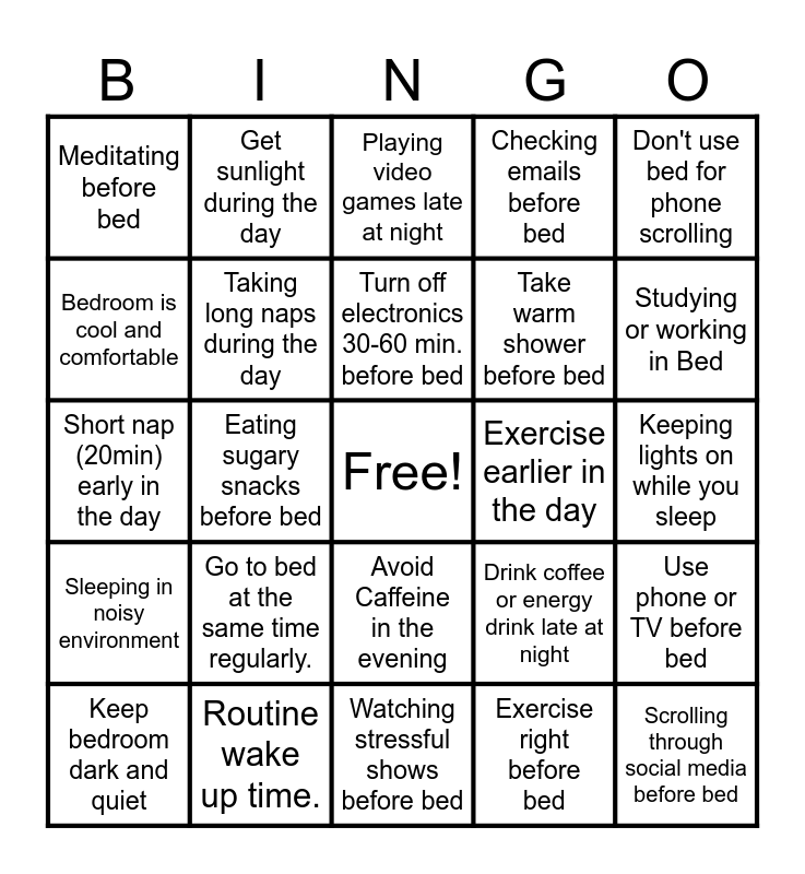This bingo card has a free space and 24 words: Go to bed at the same time regularly., Routine wake up time., Turn off electronics 30-60 min. before bed, Keep bedroom dark and quiet, Don't use bed for phone scrolling, Meditating before bed, Bedroom is cool and comfortable, Get sunlight during the day, Exercise earlier in the day, Avoid Caffeine in the evening, Take warm shower before bed, Short nap (20min) early in the day, Drink coffee or energy drink late at night, Use phone or TV before bed, Taking long naps during the day, Exercise right before bed, Keeping lights on while you sleep, Playing video games late at night, Studying or working in Bed, Eating sugary snacks before bed, Scrolling through social media before bed, Sleeping in noisy environment, Checking emails before bed and Watching stressful shows before bed.