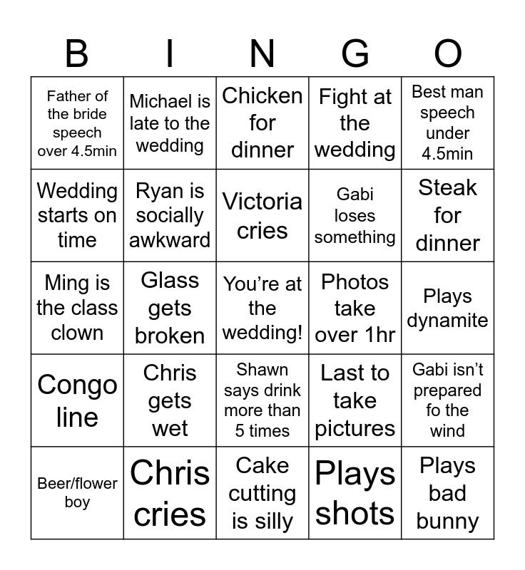 This bingo card has a free space and 24 words: Chris gets wet, Chris cries, Victoria cries, Beer/flower boy, Best man speech under 4.5min, Father of the bride speech over 4.5min, Wedding starts on time, Michael is late to the wedding, Photos take over 1hr, Shawn says drink more than 5 times, Gabi loses something, Ming is the class clown, Last to take pictures, Gabi isn’t prepared fo the wind, Ryan is socially awkward, Plays shots, Plays dynamite, Chicken for dinner, Steak for dinner, Glass gets broken, Plays bad bunny, Congo line, Fight at the wedding and Cake cutting is silly.