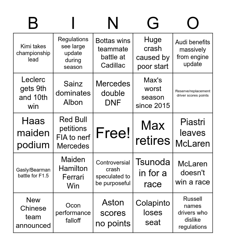 This bingo card has a free space and 24 words: Maiden Hamilton Ferrari Win, Ocon performance falloff, Mercedes double DNF, New Chinese team announced, Audi benefits massively from engine update, Kimi takes championship lead, Leclerc gets 9th and 10th win, Regulations see large update during season, Max retires, Controversial crash speculated to be purposeful, Max's worst season since 2015, Haas maiden podium, Tsunoda in for a race, McLaren doesn't win a race, Sainz dominates Albon, Colapinto loses seat, Piastri leaves McLaren, Bottas wins teammate battle at Cadillac, Reserve/replacement driver scores points, Red Bull petitions FIA to nerf Mercedes, Russell names drivers who dislike regulations, Gasly/Bearman battle for F1.5, Huge crash caused by poor start and Aston scores no points.