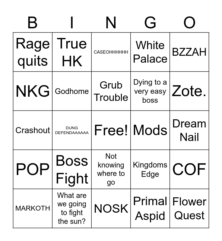 This bingo card has a free space and 24 words: Boss Fight, What are we going to fight the sun?, Grub Trouble, MARKOTH, BZZAH, Rage quits, NKG, True HK, Mods, Not knowing where to go, Dying to a very easy boss, Crashout, Kingdoms Edge, COF, Godhome, Primal Aspid, Dream Nail, CASEOHHHHHH, Zote., DUNG DEFENDAAAAAA, Flower Quest, POP, White Palace and NOSK.