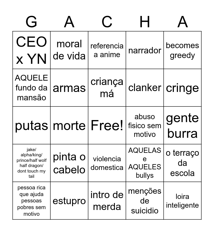 This bingo card has a free space and 24 words: pinta o cabelo, estupro, criança má, pessoa rica que ajuda pessoas pobres sem motivo, becomes greedy, CEO x YN, AQUELE fundo da mansão, moral de vida, abuso fisico sem motivo, violencia domestica, clanker, putas, AQUELAS e AQUELES bullys, o terraço da escola, armas, menções de suicidio, gente burra, referencia a anime, cringe, morte, loira inteligente, jake/ alpha/king/ prince/half wolf half dragon/ dont touch my tail, narrador and intro de merda.