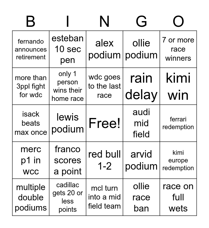 This bingo card has a free space and 24 words: franco scores a point, cadillac gets 20 or less points, wdc goes to the last race, multiple double podiums, 7 or more race winners, fernando announces retirement, more than 3ppl fight for wdc, esteban 10 sec pen, audi mid field, red bull 1-2, rain delay, isack beats max once, arvid podium, kimi europe redemption, only 1 person wins their home race, ollie race ban, ferrari redemption, alex podium, kimi win, lewis podium, race on full wets, merc p1 in wcc, ollie podium and mcl turn into a mid field team.