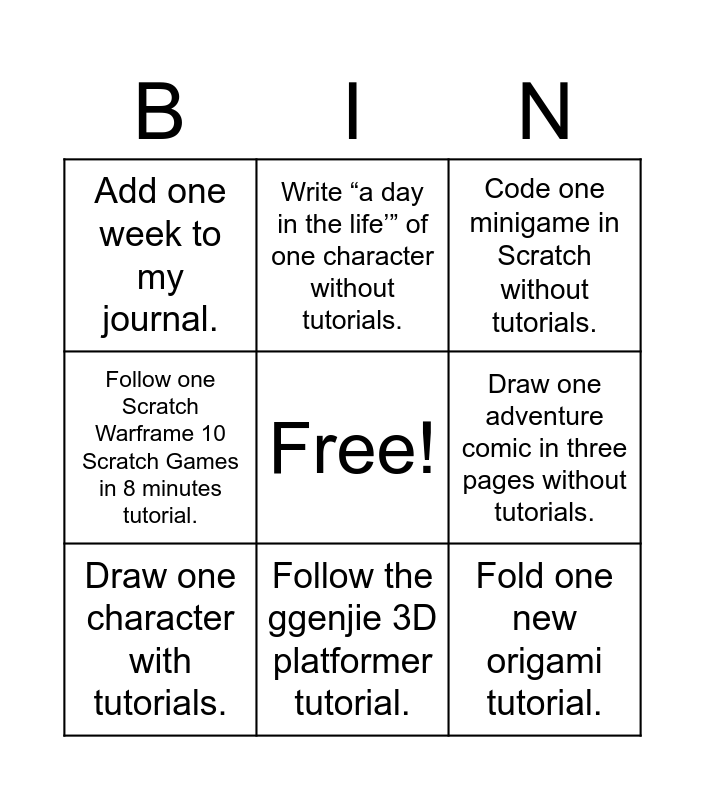 This bingo card has a free space and 8 words: Draw one adventure comic in three pages without tutorials., Code one minigame in Scratch without tutorials., Write “a day in the life’” of one character without tutorials., Draw one character with tutorials., Add one week to my journal., Fold one new origami tutorial., Follow one Scratch Warframe 10 Scratch Games in 8 minutes tutorial. and Follow the ggenjie 3D platformer tutorial..