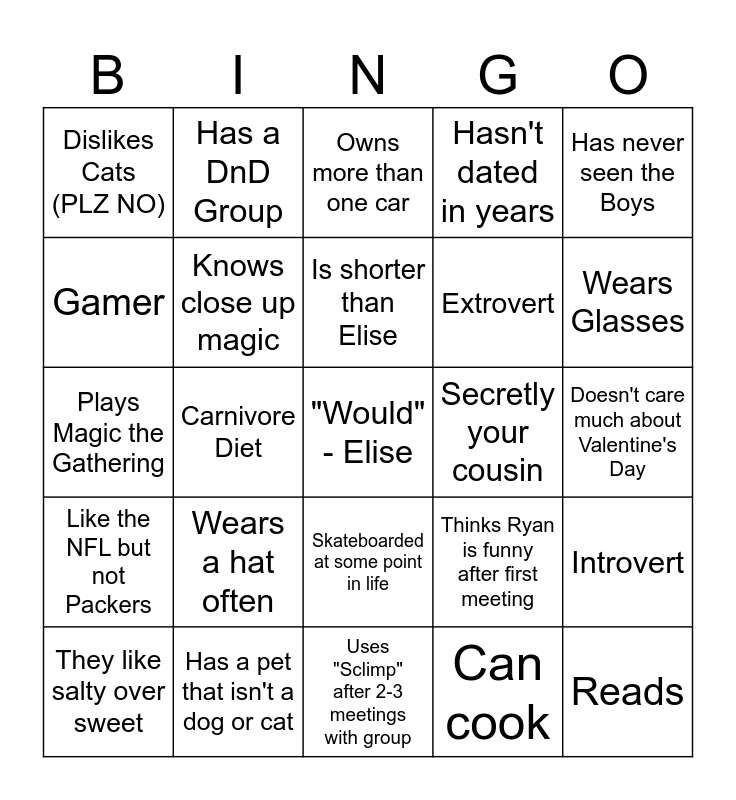 This bingo card has a free space and 24 words: Wears a hat often, Has a pet that isn't a dog or cat, Is shorter than Elise, They like salty over sweet, Has never seen the Boys, Dislikes Cats (PLZ NO), Gamer, Has a DnD Group, Secretly your cousin, Skateboarded at some point in life, Extrovert, Plays Magic the Gathering, Thinks Ryan is funny after first meeting, Introvert, Knows close up magic, Can cook, Doesn't care much about Valentine's Day, Owns more than one car, Wears Glasses, Carnivore Diet, Reads, Like the NFL but not Packers, Hasn't dated in years and Uses "Sclimp" after 2-3 meetings with group.