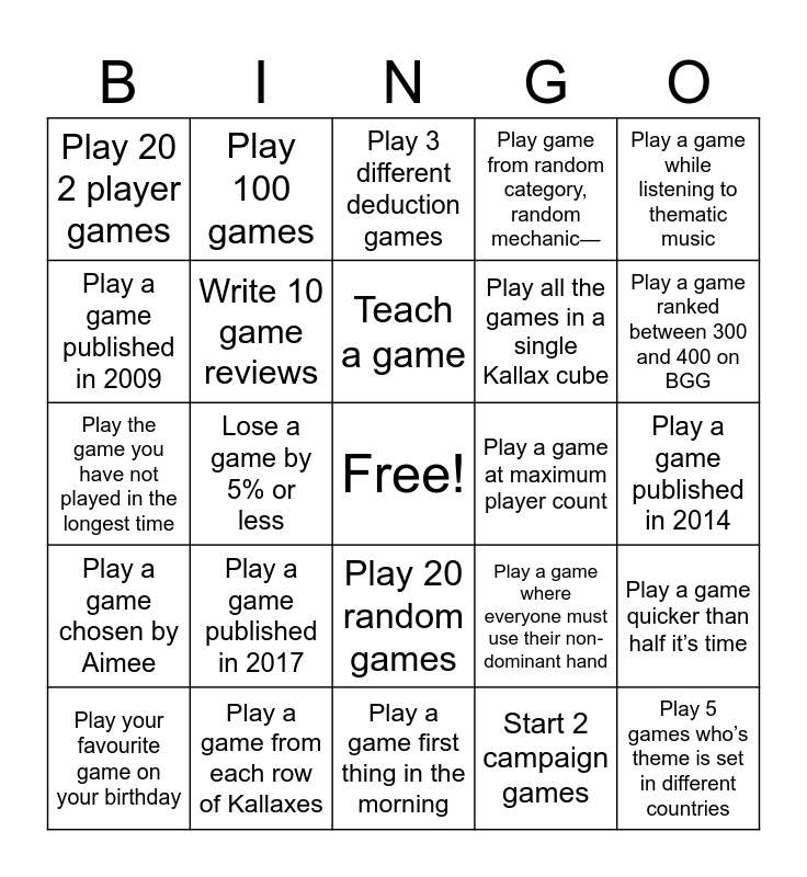 This bingo card has a free space and 80 words: Play a math game, Play 5 different adventure games, Play 3 different deduction games, Play 5 different medieval games, Play 1 travel game, Play 3 different role playing games, Play 3 different games with layering, Play a game with communication limits, Play 5 deck building games, Play 5 worker placement games, Play game from random category, random mechanic, Play game from random category, random mechanic-, Play game from random category, random mechanic—, Play 20 2 player games, Play 50 solo games, Play a game published in 2009, Play a game published in 2020, Play a game published in 2017, Play a game published in 2018, Play a game published in 2014, Play a game outside, Play a game while listening to thematic music, Play the game you have not played in the longest time, Teach a game, Write 10 game reviews, Start a bgg ranking list and add at least 5 games, Play a game ranked between 6000 and 6600 on BGG, Play a game ranked between 900 and 1000 on BGG, Play a game ranked between 5000 and 5500 on BGG, Play a game ranked between 3800 and 4100 on BGG, Play a game ranked between 300 and 400 on BGG, Play a game with unique dice, Play a game first thing in the morning, Play a game in bed, Play your favourite game on your birthday, Play a game at maximum player count, Complete an H-index of 6, Complete an H-index of 8, Go to a local board game convention, Play 5 games who’s theme is set in different countries, Play a game where everyone is new, Play 5 games in one day, Play 1 games in silence, Finish 2 campaign games, End a game in a true tie, Play 100 games, Play 150 games, Play a game with a horse, Play a game containing food while eating the food, Play a game from a designer you’ve never tried, Play a game quicker than half it’s time, Lose a game by 5% or less, Play a game where everyone must use their non-dominant hand, Play a horror game by flashlight, Play a game where the rule book is consulted 3 times or more, Play a game based on the cover, Play a game someone not present choose for you, Rank games for bgg solo ranking, Play 10 games with a deck of cards, Play 20 random games, Play all the games in a single Kallax cube, Play the oldest game you own, Play a game starting with I, Play a game starting with G, Play a game starting with W, Play a game starting with S, Play a game starting with K, Play a game chosen by someone on the internet, Play a game chosen by Amanda, Play a game chosen by Jenn, Play a game chosen by Aimee, Play a game from each row of Kallaxes, Play a game from each column of Kallaxes, Play a game from each square of a single kallax, Play a game by a Canadian designer, Play a game by a Canadian publisher, Start 2 campaign games, End a game in a tie, Play a game by a Canadian designer- and Play a game by a Canadian publisher-.