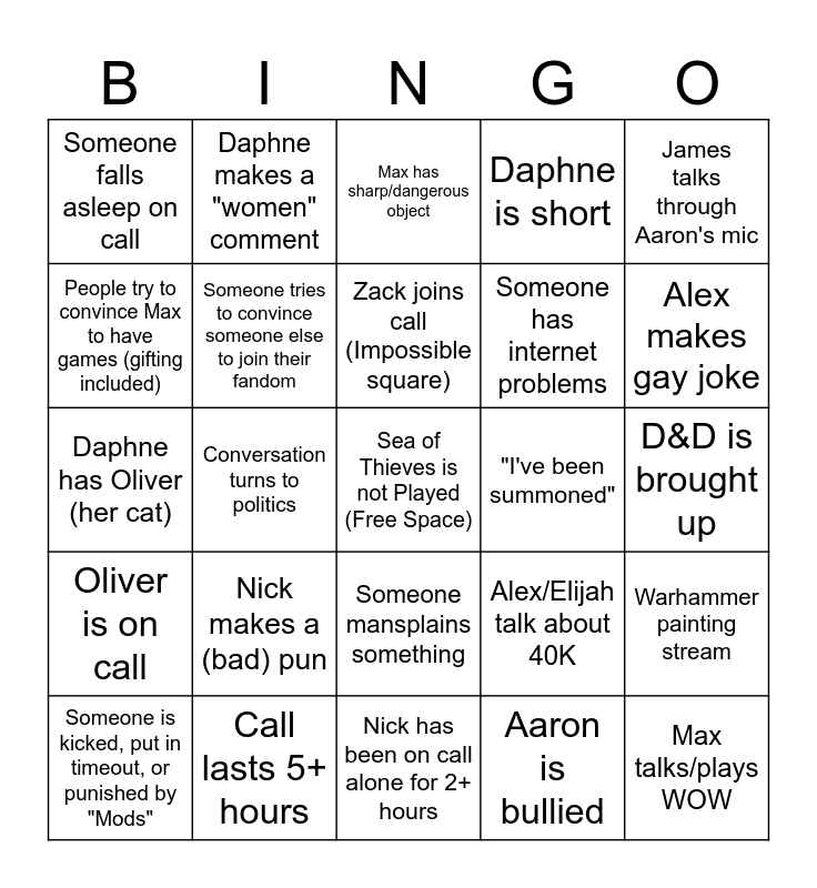 This bingo card has a free space and 30 words: Call lasts 5+ hours, Someone is ignoring homework, Conversation turns to politics, Someone forgets they are not LIVE, Someone falls asleep on call, Max has sharp/dangerous object, Someone tries to convince someone else to join their fandom, Someone mansplains something, "I've been summoned", Nick has been on call alone for 2+ hours, D&D is brought up, Max talks/plays WOW, Aaron is bullied, Nick tries to get people to play a multiplayer game, Alex makes gay joke, Someone forgets to log off, Alex/Elijah talk about 40K, Oliver is on call, Nick makes a (bad) pun, James talks through Aaron's mic, Daphne has Oliver (her cat), Scouts is brought up in conversation, Daphne makes a "women" comment, Someone has internet problems, People try to convince Max to have games (gifting included), Daphne is short, Warhammer painting stream, Someone is kicked, put in timeout, or punished by "Mods", Zack joins call (Impossible square) and Someone is does not know what game to play.