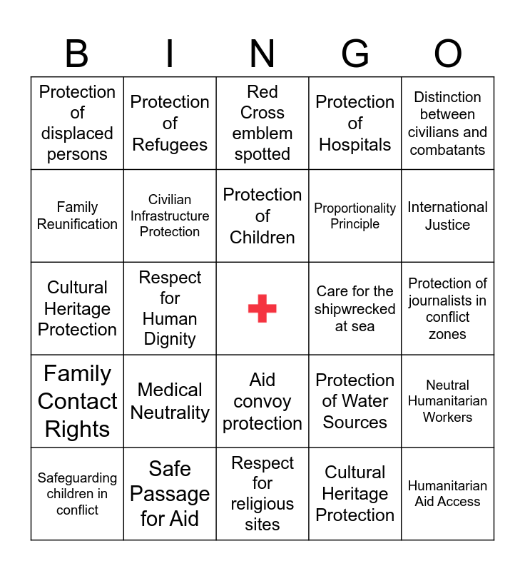 This bingo card has a free space and 29 words: Safeguarding children in conflict, Protect civilians, Respect for Human Dignity, Training people on humanitarian rules, Protection of displaced persons, Red Cross emblem spotted, Civilian Infrastructure Protection, Medical Neutrality, Care for the shipwrecked at sea, Safe Passage for Aid, Protection of journalists in conflict zones, Humanitarian Aid Access, Respect for religious sites, Cultural Heritage Protection, International Justice, International cooperation for relief, Aid convoy protection, Family Contact Rights, Distinction between civilians and combatants, Cultural Heritage Protection, Protection of Water Sources, No targeting of humanitarian workers, Proportionality Principle, Family Reunification, Protection of Hospitals, Protection of Refugees, Neutral Humanitarian Workers, Protection of Children and Relief Supplies.
