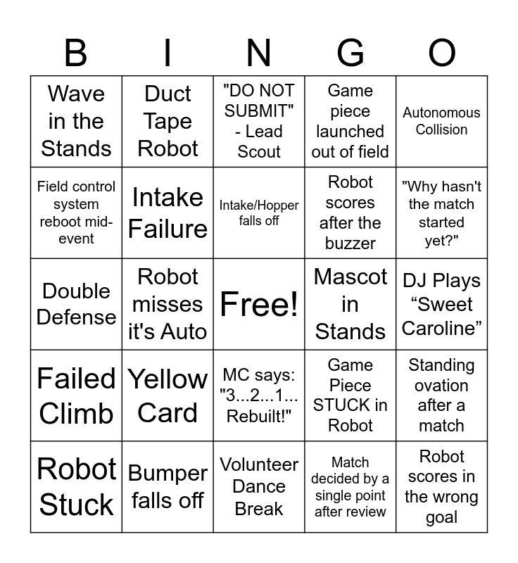 This bingo card has a free space and 33 words: Robot Tipped, 300+ Fuel Scored by an Alliance, Robot misses it's Auto, You're scouting a defense bot, Failed Climb, Intake Failure, Autonomous Collision, Robot Stuck, Duct Tape Robot, Robot Disconnects, Intake/Hopper falls off, "DO NOT SUBMIT" - Lead Scout, Robot Doesn't show up to match, Loud Team chants, Mascot in Stands, "Why hasn't the match started yet?", Bumper falls off, Double Defense, Yellow Card, Game Piece STUCK in Robot, MC says: "3...2...1... Rebuilt!", Robot Stuck on top of Fuel, Wave in the Stands, DJ Plays “Sweet Caroline”, Volunteer Dance Break, Robot scores in the wrong goal, Game piece launched out of field, Robot scores after the buzzer, Field control system reboot mid-event, Standing ovation after a match, MC forgets team numbers, Match decided by a single point after review and Robot comes back to life with 5 seconds left.