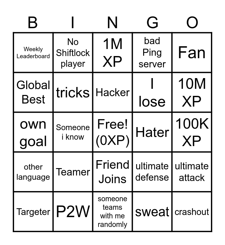 This bingo card has a free space and 24 words: Teamer, P2W, Hacker, Targeter, Fan, Weekly Leaderboard, Global Best, No Shiftlock player, Hater, Friend Joins, I lose, own goal, ultimate defense, ultimate attack, tricks, sweat, 100K XP, 1M XP, 10M XP, Someone i know, crashout, other language, bad Ping server and someone teams with me randomly.
