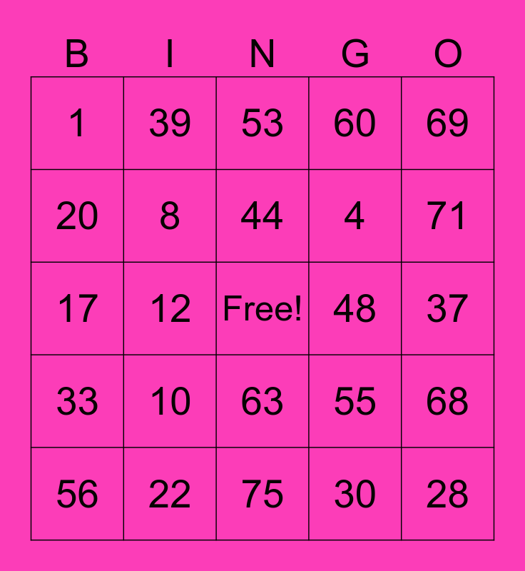 This bingo card has a free space and 24 words: 10, 22, 44, 56, 69, 1, 20, 39, 48, 63, 4, 17, 55, 68, 8, 30, 37, 53, 71, 12, 28, 33, 60 and 75.