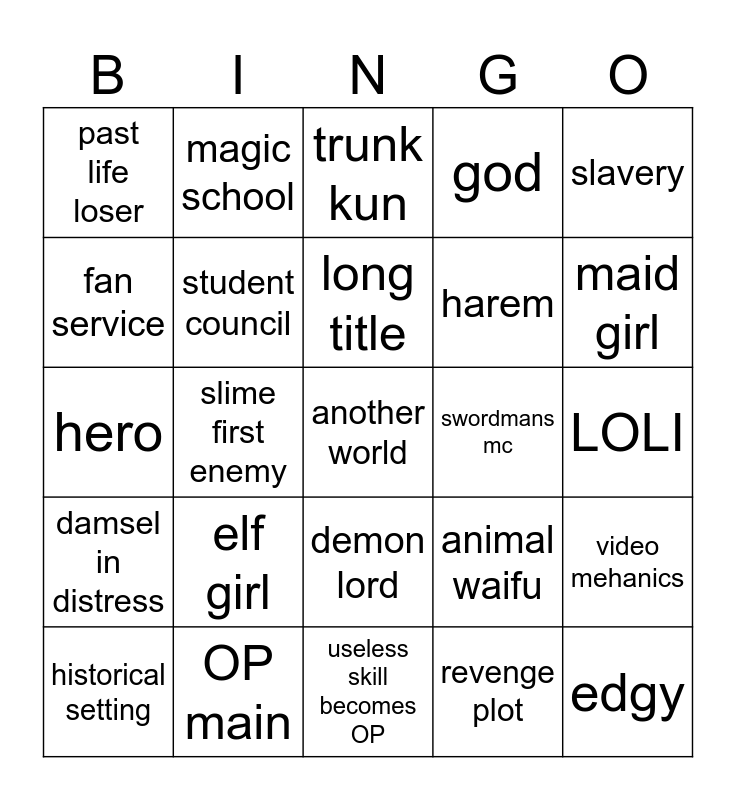 This bingo card has a free space and 24 words: elf girl, OP main, long title, historical setting, slavery, past life loser, fan service, magic school, swordmans mc, demon lord, harem, hero, animal waifu, video mehanics, student council, revenge plot, LOLI, trunk kun, maid girl, slime first enemy, edgy, damsel in distress, god and useless skill becomes OP.