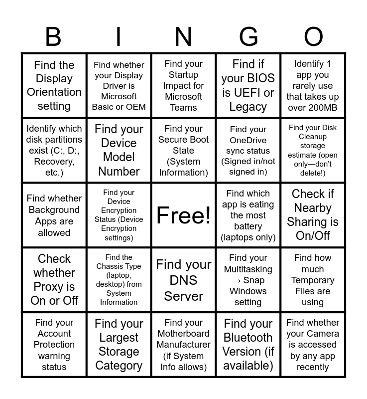 This bingo card has a free space and 109 words: Find your CPU model, Find your OS Build number, Find your IPv4 Address, Find your Link Speed, Find your Browser Version, Find your RAM amount, Find your Storage Capacity, Find your Default Gateway, Find your GPU (Display Adapter), Check if Firewall is On, Find your System Type (32/64-bit), Find your Free Space, Find your GPU Driver Date, Find your Largest Installed App, Find your Windows Edition, Find your File System (NTFS, etc.), Find your DNS Server, Find your Screen Resolution, Find your Startup Apps list, Find your Windows Version, Find your Largest Storage Category, Find your SSID (Wi-Fi Name), Find your Refresh Rate, Find your Last Update Date, Find your Processor Base Speed, Find your Device Model Number, Find your Motherboard Manufacturer (if System Info allows), Find your Total Installed Physical Memory, Find your Virtual Memory / Pagefile Size (if visible in System Info), Find whether your device supports pen or touch, Find your Device Encryption Status (Device Encryption settings), Find your Secure Boot State (System Information), Find if your BIOS is UEFI or Legacy, Find your BIOS Version/Date, Find the Serial Number (if visible & permitted—may be blocked), Find the Chassis Type (laptop, desktop) from System Information, Find your Processor Architecture (x64/x86/ARM), Find your Drive Type (SSD/HDD if visible), Find how much Temporary Files are using, Find how much space Apps & Features use, Identify the Smallest Storage Category, Find the Storage Sense status (On/Off), Find your OneDrive sync status (Signed in/not signed in), Find your Disk Cleanup storage estimate (open only—don’t delete!), Identify which disk partitions exist (C:, D:, Recovery, etc.), Find whether your Wi‑Fi Network is Private or Public, Identify your Wi‑Fi Band (2.4GHz or 5GHz), Find your MAC Address (Physical Address), Find your Network Adapter Name, Check whether Proxy is On or Off, Find your Network Reset button (don’t click!), Find your Hostname / Computer Name, Find your Bluetooth Version (if available), Find your Network Profile Type (Private/Public), Find your Signal Strength (Wi‑Fi properties), Find your HDR setting (On/Off), Find your Night Light status, Find your Graphics Memory (Dedicated Memory value), Find your Monitor Refresh Rate Options, Find the Display Orientation setting, Find whether your Display Driver is Microsoft Basic or OEM, Identify how many Displays your device supports, Find your Scaling Percentage (125%, 150%, etc.), Check whether Smart App Control is On/Off (Windows 11), Find your Ransomware Protection status, Find whether Controlled Folder Access is On/Off, Check Camera Access permissions, Check Microphone Access permissions, Find whether Memory Integrity is enabled (if available), Find your Account Protection warning status, Find your Sign‑in options (PIN, Password, Biometrics), Find your Startup Impact for Microsoft Teams, Find which app is eating the most battery (laptops only), Find whether Background Apps are allowed, Identify your default browser, Identify your default music player, Identify your default PDF viewer, Identify 1 app you rarely use that takes up over 200MB, Find which app was recently updated, Find the app with the oldest version date, Find your Task Manager → Performance → CPU % usage, Find how long your computer has been up (Uptime, Task Manager), Find your Startup Impact for Microsoft Teams, Find which app is eating the most battery (laptops only), Find whether Background Apps are allowed, Identify your default browser, Identify your default music player, Identify your default PDF viewer, Identify 1 app you rarely use that takes up over 200MB, Find which app was recently updated, Find the app with the oldest version date, Find your Task Manager → Performance → CPU % usage, Find how long your computer has been up (Uptime, Task Manager), Identify your Default Playback Device, Identify your Default Recording Device, Find your Microphone Format (44.1 kHz / 48 kHz), Find your Audio Driver Version, Find whether Spatial Sound is enabled, Find whether your Camera is accessed by any app recently, Find your Camera Resolution (if shown), Find your Clipboard History toggle, Find your Focus Assist setting, Find your Multitasking → Snap Windows setting, Check if Nearby Sharing is On/Off, Find your Time Zone, Find whether Automatic Time Sync is enabled, Find your Region Format, Find your Language Pack installation and Find your Cloud Sync Status (OneDrive).