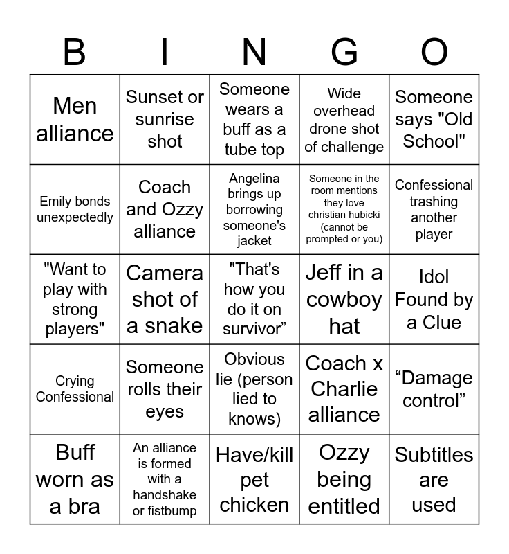 This bingo card has 108 words: Free!, Coach calls himself "The Dragon Slayer", Camera shot of a snake, Camera shot of a spider, Rizo says "R-I-Z-G-O-D RIZGOD BAYBEE", Christian mentions something super nerdy, Someone struggles to open a coconut, Tribe makes fire, Someone cries, Jonathan does an impressive feat of strength, Jeff says "Dig Deep", Someone finds an idol or advantage, Jeff says "50 seasons", Jeff says "The game has changed", Dramatic helicopter or boat arrival shot, Jeff says "Got nothing for ya", Sunset or sunrise shot, People whispering to each other at tribal, Someone says "Blindside", Underwater camera shot, Someone rolls their eyes, Ozzy goes fishing, Jeff says "Jonathan…" in disbelief, Someone does "tai chi" or "meditation", "White Lotus" is mentioned, Someone says "Old School", Emily bonds unexpectedly, Wide overhead drone shot of challenge, Night vision shot, Camera zooms in on an advantage or idol, Subtitles are used, An alliance is formed with a handshake or fistbump, Someone comes up with a name for an alliance, Someone climbs a tree, Medical is called in, Someone wears a buff as a tube top, Idol is played incorrectly, Someone is sent home with an idol, Charlie mentions "Taylor Swift", "That's how you do it on survivor”, Christian wins a physical challenge no one expects, Someone eats a bug, Have/kill pet chicken, Jeff makes a sassy comment, Someone quits, Coach and Ozzy alliance, Someone prompts negotiations with Jeff, Angelina brings up borrowing someone's jacket, Someone spells someone's name wrong at tribal council, Jeff in a cowboy hat, Jonathan CARRIES team, Confessional trashing another player, Crying Confessional, Close up of shocked face after tribal, Celebrity Cameo, Bad weather, Hilarious dive into water, Challenge lead blown on puzzle, Frustration at JOE'S gameplay, Men alliance, Women alliance, Old school alliance, Old people not understanding a pop culture ref, Buff worn in an interesting way, Ozzy wins individual immunity, Water well strategy, Meditation, “Damage control”, Survivor 50 Challenge mention, Coach x Charlie alliance, Obvious lie (person lied to knows), "Want to play with strong players", Ozzy being entitled, Bromance, Huge challenge comeback, Christian does a puzzle, "Keep the tribe strong”, Unecessary idol play, Weird jury outfit, Stupid metaphor, Somebody throws someone under the bus, Player claims to be swing vote, Someone says "RIZGOD" (not him), Fear of women's alliance, Rock paper scissors decision, Tree mail is read, "Playing under the radar", Drama over who's taken for reward, Colby visible frustrated after loosing, Billie Eilish boomerang idol, Cirie sits out a challenge, Someone in the room mentions they love christian hubicki (cannot be prompted or you), Stephanie gets annoyed at someone, “The last time I was on the island”, Tina or Lorrie refer to Colby being “The Best”, Shot of snake, Eating Coconuts, Buff worn as a bra, Underwear, Endurance Challenge, Food Challenge, Some type of maze challenge, Balance Challenge, Hanging Challenge, Idol Found by rock, Idol Found in a tree, Idol Found by a Clue and Good/Bad Advantage.