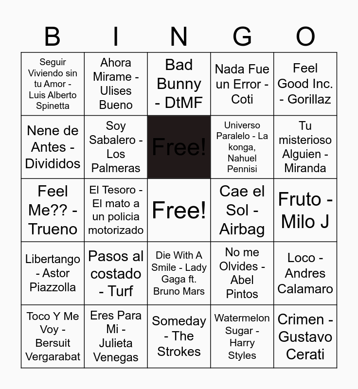 This bingo card has a free space and 42 words: Free!, Free!, Si el Amor se Cae - Los Cafres, Pasos al costado - Turf, Watermelon Sugar - Harry Styles, Loco - Andres Calamaro, Crimen - Gustavo Cerati, Nunca es Suficiente - Los Angeles Azules ft Natalia Lafourcade, Bad Bunny - DtMF, Die With A Smile - Lady Gaga ft. Bruno Mars, Fruto - Milo J, Tu misterioso Alguien - Miranda, El Tesoro - El mato a un policia motorizado, Feel Good Inc. - Gorillaz, Desde el Puente Carretero - Los Manseron Santiagueños, No me Olvides - Abel Pintos, Adios Amor - La delio Valdez, Ke personaje, Feel Me?? - Trueno, Dispara - Nicki Nicole, Milo J, Ahora Mirame - Ulises Bueno, Nene de Antes - Divididos, Beat it - Michael Jackson, La Fama - Rosalia, The Weeknd, Seguir Viviendo sin tu Amor - Luis Alberto Spinetta, Como Ali - Los Piojos, You Shook Me All Night Long - AC/DC, Universo Paralelo - La konga, Nahuel Pennisi, ¿Que tengo que hacer? - Daddy Yankee, La sin Corazon - Chaqueño Palavecino, Sin Cadenas - Los Pericos, Espresso - Sabrina Carpenter, Libertango - Astor Piazzolla, Soy Sabalero - Los Palmeras, Someday - The Strokes, A las Nueve - No Te Va Gustar, Toco Y Me Voy - Bersuit Vergarabat, Eres Para Mi - Julieta Venegas, Cae el Sol - Airbag, Ahora Te Puedes Marchar - Luis Miguel, Arrancarmelo - Wos, Nada Fue un Error - Coti and Muerte en Hawaii.