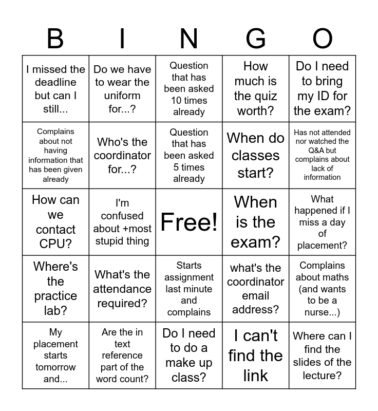 This bingo card has a free space and 24 words: What's the attendance required?, Are the in text reference part of the word count?, Question that has been asked 5 times already, My placement starts tomorrow and..., Do I need to bring my ID for the exam?, I missed the deadline but can I still..., Complains about not having information that has been given already, Do we have to wear the uniform for...?, When is the exam?, Starts assignment last minute and complains, When do classes start?, How can we contact CPU?, what's the coordinator email address?, Complains about maths (and wants to be a nurse...), Who's the coordinator for...?, I can't find the link, What happened if I miss a day of placement?, Question that has been asked 10 times already, Has not attended nor watched the Q&A but complains about lack of information, I'm confused about +most stupid thing, Where can I find the slides of the lecture?, Where's the practice lab?, How much is the quiz worth? and Do I need to do a make up class?.