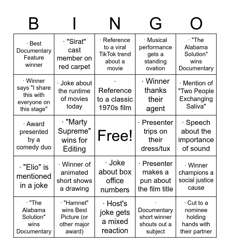 This bingo card has a free space and 275 words: Best Actor/Actress winner announced, · "Hamnet" wins Best Picture (or other major award), · Host's joke gets a mixed reaction, · Presenter chokes up while reading the nominees, · Cut to a nominee's child in the audience, · Thank you to a historical figure for inspiration, · Joke about a film's budget, · Reference to a viral TikTok trend about a movie, · Winner talks about the therapeutic nature of acting, · Mention of "Two People Exchanging Saliva", · A previous winner returns to present a major award, · The orchestra plays someone off mid-sentence, · Winner from "Marty Supreme" on stage, · Cut to Delroy Lindo clapping proudly, · Speech about the power of music in film, · Joke about the number of sequels nominated, · Winner of animated short shows a drawing, · Tribute to a costume designer, · A nominee is shown taking a deep breath before a category, · "The Alabama Solution" wins Documentary, · Host does a bit involving a famous director in the audience, · Winner thanks their therapist, · Cut to two nominees sharing a laugh, · Joke about the "Oscar buzz" surrounding a film, · Winner says "I share this with everyone on this stage", · First time Oscar winner, · Winner thanks their mom, · Standing ovation, · Music cuts off speech, · Political reference during speech, · Host roasts someone in the audience, · Someone trips or stumbles on stage, · Reference to movie theaters vs streaming, · Sheer dress on the red carpet, · Award winner kisses their Oscar, · Mention of A.I. in filmmaking, · Presenter struggles to pronounce a name, · "I'd like to thank the Academy", · Joke about "KPop Demon Hunters", · Cut to Leonardo DiCaprio smiling, · Acceptance speech gets bleeped out, · Video montage of films, · Winner exits stage the wrong way, · Emotional family mention in speech, · Animated feature wins its category, · "It's an honor just to be nominated", · Tribute to a legendary actor, · Surprise upset win, · Awkward pause before announcing winner, · International film wins major category, · Conan changes outfits, · "Hamnet" wins an award, · Food delivery on stage, · Someone breaks into song, · Endorsement of seeing movies in theaters, · "Timmy Tim" child from Hamnet is shown, · Kylie Jenner joke, · Joke about two Michael B. Jordans in "Sinners", · Winner thanks their agent, · Sunglasses worn inside, · Presenter messes up their line, · Immigration or deportation mentioned, · Winner makes everyone laugh during speech, · Celebrity fixes outfit on camera, · Cut to someone tearing up in audience, · Winner gets emotional / cries, · Joke that doesn't get many laughs, · A film wins multiple awards in a row, · Actress wins for directorial debut, · Big smile reaction from a nominee, · Someone forgets to thank their spouse, · "This wasn't expected", · Best Picture nominee clip montage, · Vampire joke, · First-time Oscar winner moment, · Best Original Screenplay presented, · "Marty Supreme" wins an award, · Conan roasts a major blockbuster film, · Technical difficulties or awkward pause, · Oscar raised in the air, · Bold red dress on the red carpet, · Winner mentions fellow nominees, · Award winner kisses partner before going on stage, · Conan references hosting two years in a row, · Winner champions a social justice cause, · Michael B. Jordan smiling, · Emma Stone clapping, · Music from "KPop Demon Hunters" plays, · Presenter thanks God, · Winner from "Sinners" on stage, · Standing ovation lasts over 30 seconds, · Acceptance speech cut off by music, · Mention of "Train Dreams", · "The Secret Agent" wins an award, · Documentary feature champion, · Joke about the Safdie Brothers, · Bleeped out profanity, · Winner waiting for different music, · Cut to nominee in the audience, · "I didn't write that", · Best Director winner on stage, · "Frankenstein" wins a technical award, · Joke about streaming services, · Winner dedicates award to their child, · Presenter wears a vintage tuxedo, · Cut to a nominee mouthing "wow", · Political thanks to a specific group, · Reference to "F1" speed, · Actor wins for a musical role, · Mention of "The Smashing Machine", · Best International Feature acceptance in English, · Speech includes a quote from a classic film, · Winner trips walking up the stairs, · In Memoriam segment gets longest applause, · Cut to a former winner in the audience, · Joke comparing a film to a board game, · "Bugonia" cast member on stage, · Visual effects breakdown reel, · Winner shouts out their dialect coach, · Someone's dress gets stepped on, · Award presented by a comedy duo, · "Sentimental Value" wins its first award, · Winner compares Oscar to a sandwich, · Host interacts with a famous musician in the crowd, · Acceptance speech includes a metaphor about film, · First award of the night presented, · "Sinners" wins for Cinematography, · Host enters from the ceiling, · Winner's speech is mostly in another language, · Cut to a nominee checking their phone (jokingly), · Thank you to a streaming platform, · Joke about the length of "One Battle After Another", · Reference to "Avatar: Fire and Ash", · Winner does a dance on stage, · Presenter forgets the name of the movie, · Actor wins for a dramatic transformation, · Mention of "The Ugly Stepsister", · In Memoriam includes a surprise omission, · Cut to a director looking relieved, · Speech about the importance of sound, · Host makes a joke about AI screenwriting, · "Zootopia 2" joke during animation category, · Winner wipes tears with their speech paper, · A former child star presents an award, · Political reference without naming a person, · "Blue Moon" mentioned in a speech, · Winner brings a friend on stage, · Joke about box office numbers, · Someone's phone alarm goes off in the audience, · Winner thanks their acting coach, · Best Adapted Screenplay winner, · "Ha