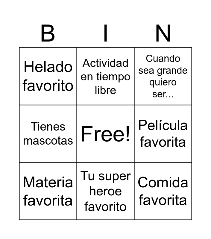 This bingo card has a free space and 12 words: Color favorito, Cantidad de hermanos, Comida favorita, Película favorita, Actividad en tiempo libre, Cuando sea grande quiero ser..., Tu super heroe favorito, Animal favorito, Helado favorito, Tienes mascotas, Materia favorita and Canción favorita.