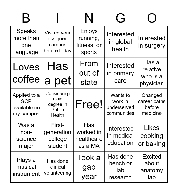 This bingo card has a free space and 24 words: First-generation college student, Has done clinical volunteering, From out of state, Plays a musical instrument, Interested in surgery, Speaks more than one language, Loves coffee, Visited your assigned campus before today, Wants to work in underserved communities, Has worked in healthcare as a MA, Interested in primary care, Applied to a SCP available on my campus, Interested in medical education, Likes cooking or baking, Has a pet, Has done bench or lab research, Changed career paths before medicine, Enjoys running, fitness, or sports, Has a relative who is a physician, Considering a joint degree in Public Health, Excited about anatomy lab, Was a non-science major, Interested in global health and Took a gap year.
