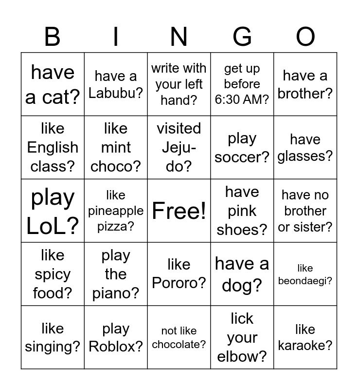 This bingo card has a free space and 24 words: play the piano?, play Roblox?, visited Jeju-do?, like singing?, have a brother?, have a cat?, like English class?, have a Labubu?, have pink shoes?, like Pororo?, play soccer?, play LoL?, have a dog?, like beondaegi?, like mint choco?, lick your elbow?, have no brother or sister?, write with your left hand?, have glasses?, like pineapple pizza?, like karaoke?, like spicy food?, get up before 6:30 AM? and not like chocolate?.
