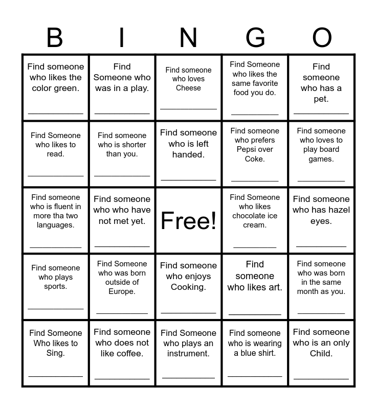 This bingo card has a free space and 25 words: Find Someone who was born outside of Europe. ____________, Find Someone who plays an instrument. ___________, Find someone who is left handed. ___________, Find Someone Who likes to Sing. ____________, Find someone who has a pet. ___________, Find someone who likes the color green. ___________, Find Someone who likes to read. _____________, Find Someone who was in a play. ___________, Find Someone who likes chocolate ice cream. __________, Find someone who enjoys Cooking. ___________, Find someone who prefers Pepsi over Coke. ___________, Find someone who is fluent in more tha two languages. ____________, Find someone who likes art. __________, Find someone who was born in the same month as you. ___________, Find someone who is shorter than you. _____________, Find someone who has been to the mountains. ___________, Find someone who has hazel eyes. __________, Find someone who loves Cheese ______________, Find someone who loves to play board games. ___________, Find someone who who have not met yet. ___________, Find someone who is an only Child. ___________, Find someone who does not like coffee. ___________, Find someone who plays sports. _____________, Find Someone who likes the same favorite food you do. ___________ and Find someone who is wearing a blue shirt. ____________.