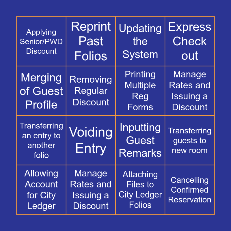This bingo card has 16 words: Allowing Account for City Ledger, Manage Rates and Issuing a Discount, Updating the System, Express Check out, Merging of Guest Profile, Reprint Past Folios, Inputting Guest Remarks, Transferring guests to new room, Applying Senior/PWD Discount, Removing Regular Discount, Attaching Files to City Ledger Folios, Manage Rates and Issuing a Discount, Transferring an entry to another folio, Voiding Entry, Printing Multiple Reg Forms and Cancelling Confirmed Reservation.