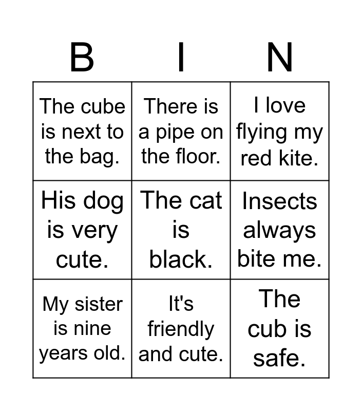 This bingo card has 9 words: My sister is nine years old., I love flying my red kite., There is a pipe on the floor., His dog is very cute., The cube is next to the bag., Insects always bite me., The cat is black., The cub is safe. and It's friendly and cute..