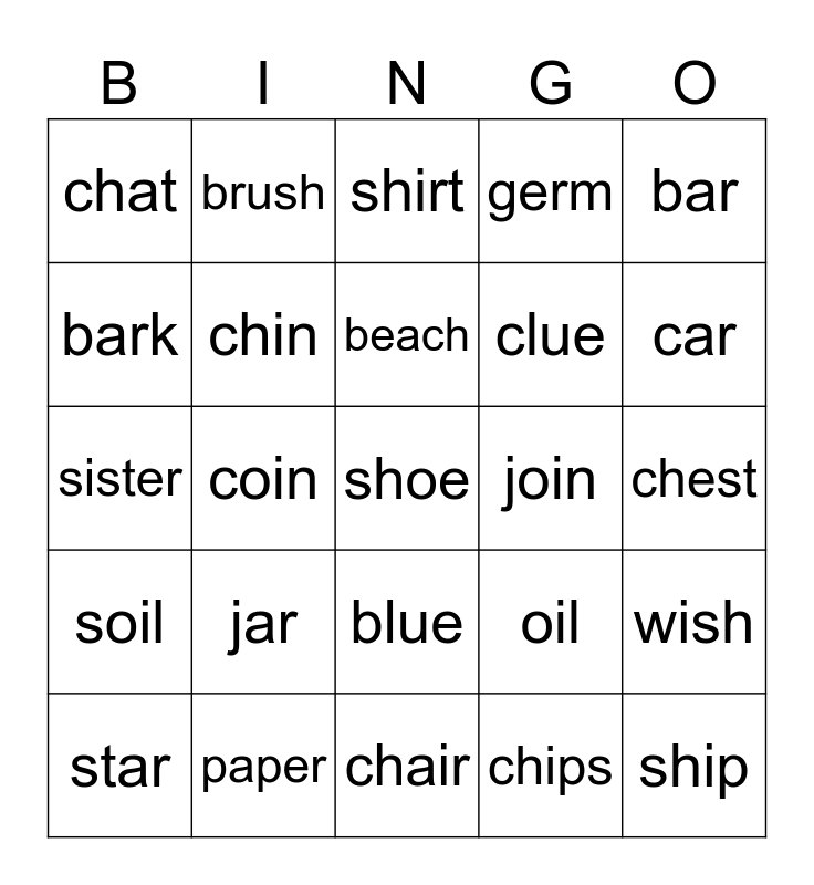 This bingo card has a free space and 29 words: star, tiger, coin, true, chat, shirt, chin, jar, join, paper, chest, ship, chair, chips, car, water, blue, soil, bar, sister, oil, true, clue, bark, germ, brush, wish, beach and peach.