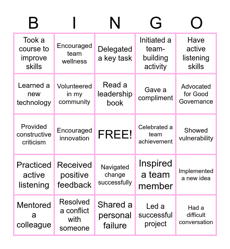 This bingo card has a free space and 24 words: Mentored a colleague, Received positive feedback, Read a leadership book, Led a successful project, Have active listening skills, Took a course to improve skills, Encouraged team wellness, Delegated a key task, Celebrated a team achievement, Showed vulnerability, Provided constructive criticism, Volunteered in my community, Inspired a team member, Implemented a new idea, Learned a new technology, Resolved a conflict with someone, Shared a personal failure, Initiated a team-building activity, Advocated for Good Governance, Practiced active listening, Encouraged innovation, Navigated change successfully, Gave a compliment and Had a difficult conversation.