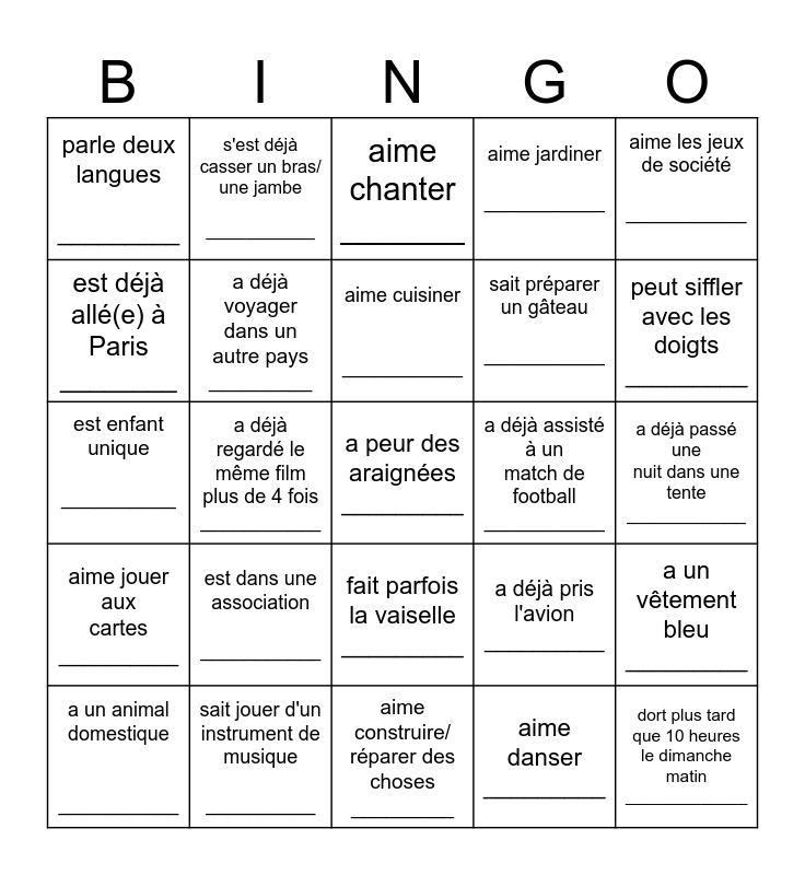 This bingo card has a free space and 24 words: est dans une association ___________, sait jouer d'un instrument de musique __________, aime cuisiner ___________, a un animal domestique ___________, aime les jeux de société ___________, parle deux langues _________, est déjà allé(e) à Paris ________, s'est déjà casser un bras/ une jambe ___________, a déjà assisté à un match de football ___________, fait parfois la vaiselle _________, sait préparer un gâteau ___________, est enfant unique __________, a déjà pris l'avion __________, a un vêtement bleu _________, a déjà voyager dans un autre pays _________, aime danser _________, a déjà passé une nuit dans une tente ____________, aime chanter _______, peut siffler avec les doigts _________, a déjà regardé le même film plus de 4 fois ___________, dort plus tard que 10 heures le dimanche matin _____________, aime jouer aux cartes __________, aime jardiner ___________ and aime construire/ réparer des choses _________.