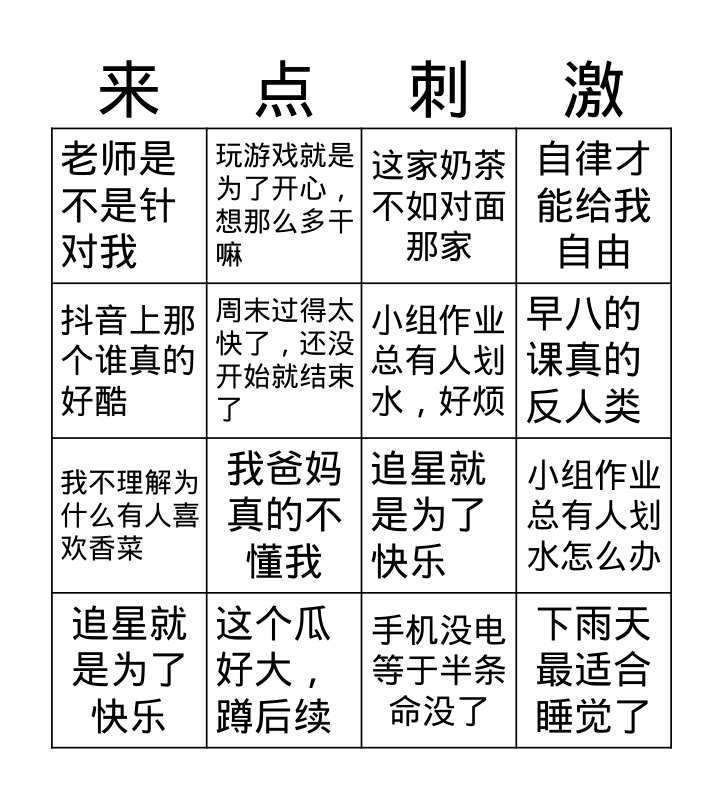 This bingo card has 24 words: 最近作业好多啊,累死了, 这家店绝了,太好吃了, 早八的课真的反人类, 得有curve吧, 抖音上那个谁真的好酷, 老师是不是针对我, 周末过得太快了,还没开始就结束了, 玩游戏就是为了开心,想那么多干嘛, 这个瓜好大,蹲后续, 这次考试好难,要挂了, 我不理解为什么有人喜欢香菜, 追星就是为了快乐, 我们学校食堂好难吃, 手机没电等于半条命没了, 小组作业总有人划水,好烦, 我想回宿舍, 手机没电等于半条命没了, 这家奶茶不如对面那家, 我爸妈真的不懂我, 小组作业总有人划水怎么办, 追星就是为了快乐, 下雨天最适合睡觉了, 自律才能给我自由 and 考试前熬夜复习有用吗?.