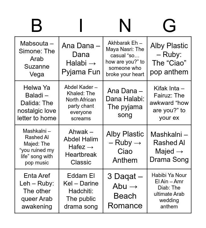 This bingo card has 61 words: Batwanes Beek – Warda Al-Jazairia: Bonus repeat diva moment, Ahwak – Abdel Halim Hafez: Vintage Arab heartbreak from the king of romance, Leih Beydary Keda – Ruby: The gym song, Habibi Ya Nour El Ain – Amr Diab: The ultimate Arab wedding anthem, Agoul Ahwak – Haifa Wehbe: The queer Arab awakening, Batwanes Beek – Warda Al-Jazairia: The diva song about loving someone’s company, Ana Dana – Dana Halabi: The pyjama song, Sidi Mansour – Saber Al Rebai: The song that makes every Arab wedding go wild, Mashkalni – Rashed Al Majed: The “you ruined my life” song with pop music, Tamally Ma'ak – Amr Diab: The dramatic “I want to be with you forever” love confession, Alby Plastic – Ruby: The “Ciao” pop anthem, Nassam Alayna El Hawa – Fairuz: The nostalgic song every Arab knows by heart, Abdel Kader – Khaled: The North African party chant everyone screams, 3 Daqat – Abu: The romantic beach love song, Ya Bent El Sultan – Ragheb Alama: The dramatic Arab diva entrance song, Mabsouta – Simone: The Arab Suzanne Vega, Enta Aref Leh – Ruby: The other queer Arab awakening, Helwa Ya Baladi – Dalida: The nostalgic love letter to home, Didi – Khaled: The 90s Arab song the whole world danced to, Kifak Inta – Fairuz: The awkward “how are you?” to your ex, Eddam El Kel – Darine Hadchiti: The public drama song, Akhbarak Eh – Maya Nasri: The casual “so… how are you?” to someone who broke your heart, Habibi Ya Eini – Maya Yazbek: The dramatic crying in the mirror song, Ya Tabtab Wa Dallaa – Nancy Ajram: The song where she forgives a terrible boyfriend, Ah W Noss – Nancy Ajram: The “kiss me again” song, Mandam Aleik – Nawal Al Zoghbi: The “you will regret losing me” anthem, Mesaytara – Lamis Kan: The confident Arab boss lady energy, Alf Leila w Leila – Umm Kulthum: The most legendary Arab love song ever, Ahwak – Abdel Halim Hafez → Heartbreak Classic, Leih Beydary Keda – Ruby → Gym Pop, Habibi Ya Nour El Ain – Amr Diab → Wedding Anthem, Macarena – Los del Río → Dance Hit, Agoul Ahwak – Haifa Wehbe → Queer Diva, Batwanes Beek – Warda Al-Jazairia → Diva Love, Ana Dana – Dana Halabi → Pyjama Fun, Aserejé – Las Ketchup → Crazy Lyrics, Sidi Mansour – Saber Al Rebai → Wedding Wild, Mashkalni – Rashed Al Majed → Drama Song, Tamally Ma'ak – Amr Diab → Romantic Love, Alby Plastic – Ruby → Ciao Anthem, …Baby One More Time – Britney Spears → Pop Classic, Nassam Alayna El Hawa – Fairuz → Nostalgic Song, 3 Daqat – Abu → Beach Romance, Ya Bent El Sultan – Ragheb Alama → Diva Entrance, Mabsouta – Simone → Carefree Fun, Enta Aref Leh – Ruby → Queer Awakening, Wannabe – Spice Girls → Girl Power, Helwa Ya Baladi – Dalida → Home Love, Didi – Khaled → 90s Dance, Abdel Kader – Khaled → Party Chant, Kifak Inta – Fairuz → Awkward Ex, I Want It That Way – Backstreet Boys → Boyband Hit, Eddam El Kel – Darine Hadchiti → Public Drama, Akhbarak Eh – Maya Nasri → Casual Heartbreak, Habibi Ya Eini – Maya Yazbek → Mirror Drama, Ya Tabtab Wa Dallaa – Nancy Ajram → Forgive Boyfriend, Ah W Noss – Nancy Ajram → Kiss Again, Mandam Aleik – Nawal Al Zoghbi → Regret Anthem, Mesaytara – Lamis Kan → Boss Lady, Alf Leila w Leila – Umm Kulthum → Legendary Love and Magapay – Angela Dimitriou → Mediterranean Dance.