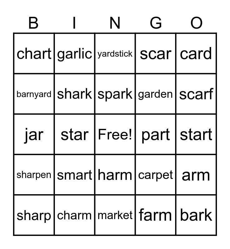 This bingo card has a free space and 27 words: carpet, target, garden, market, barnyard, yardstick, garlic, sharpen, part, arm, jar, scar, sharp, charm, scarf, March, shark, spark, smart, chart, start, farm, star, bark, harm, card and pancake.