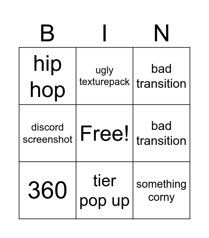This bingo card has a free space and 10 words: tier pop up, bad transition, hip hop, something corny, discord screenshot, 360, ugly texturepack, grayscale, bad transition and grayscale.