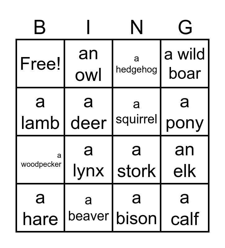 This bingo card has 16 words: a hare, a beaver, a hedgehog, a wild boar, a lamb, an owl, a stork, an elk, Free!, a deer, a bison, a pony, a woodpecker, a lynx, a squirrel and a calf.
