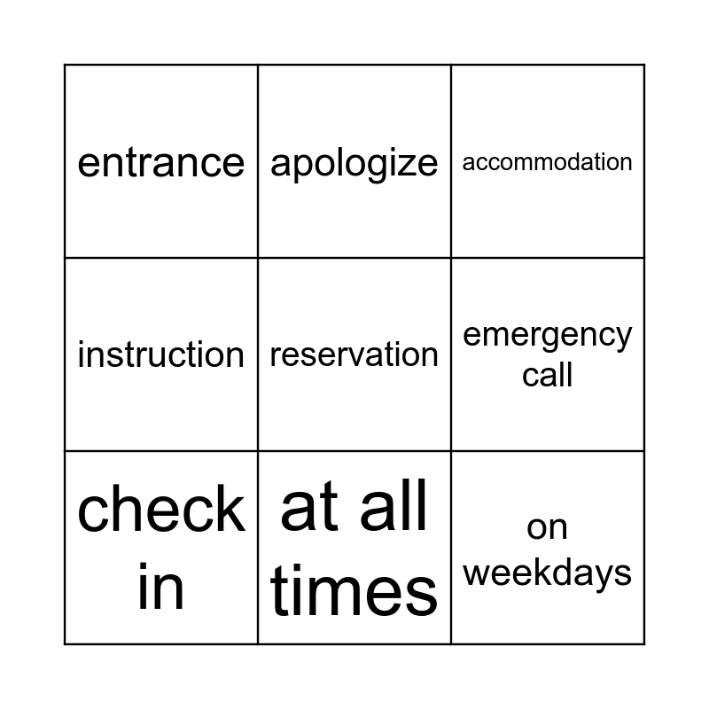 This bingo card has 9 words: check in, accommodation, apologize, instruction, entrance, emergency call, reservation, on weekdays and at all times.