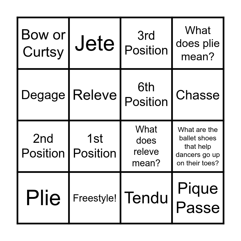 This bingo card has 16 words: Freestyle!, What are the ballet shoes that help dancers go up on their toes?, 3rd Position, Bow or Curtsy, 2nd Position, Jete, What does releve mean?, Tendu, Degage, Releve, Plie, What does plie mean?, 1st Position, Chasse, 6th Position and Pique Passe.
