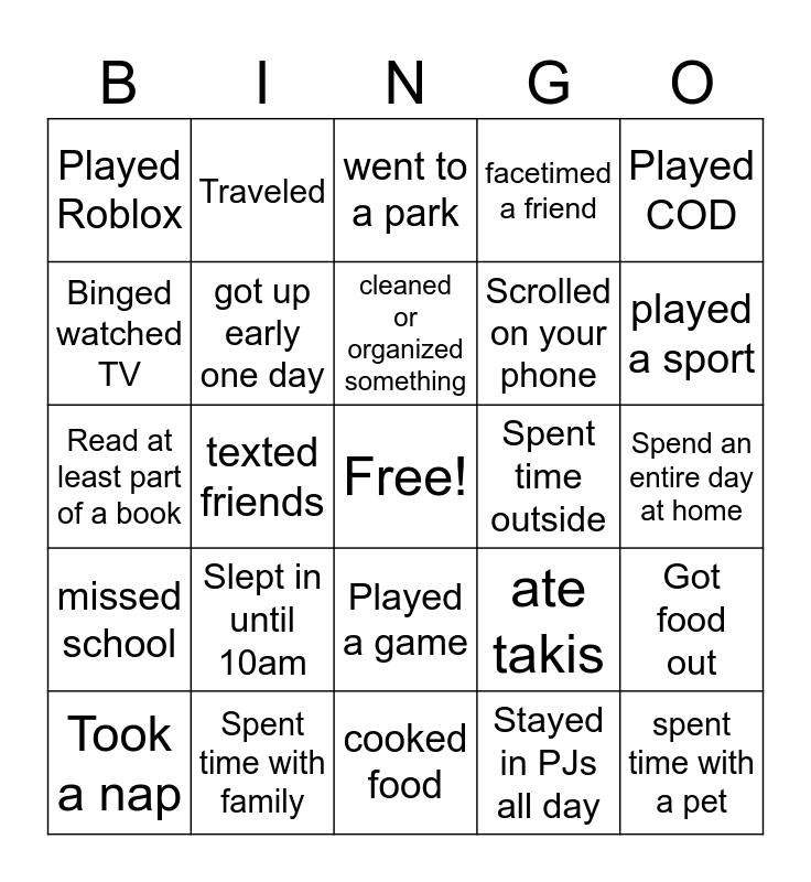 This bingo card has a free space and 24 words: Slept in until 10am, Spent time with family, cleaned or organized something, Took a nap, Played COD, Played Roblox, Binged watched TV, Traveled, Spent time outside, Played a game, Scrolled on your phone, Read at least part of a book, ate takis, Got food out, got up early one day, Stayed in PJs all day, Spend an entire day at home, went to a park, played a sport, texted friends, spent time with a pet, missed school, facetimed a friend and cooked food.