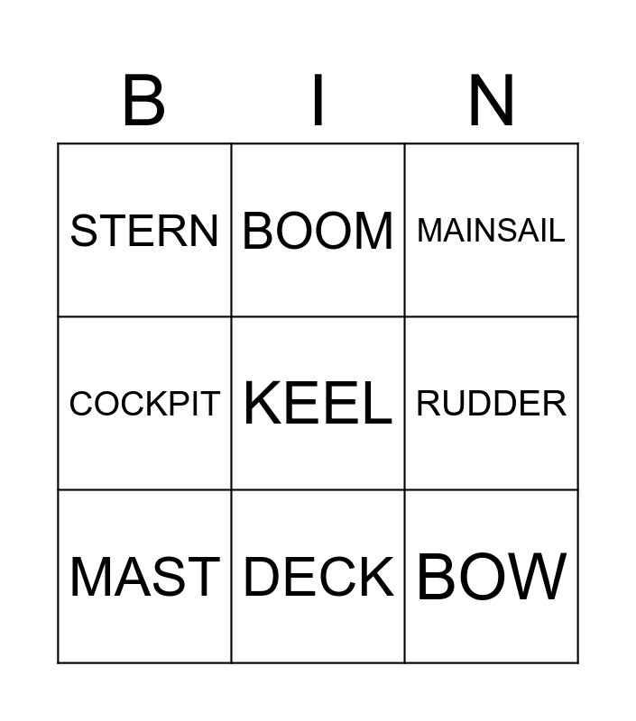 This bingo card has 9 words: MAST, MAINSAIL, BOOM, COCKPIT, STERN, RUDDER, KEEL, BOW and DECK.