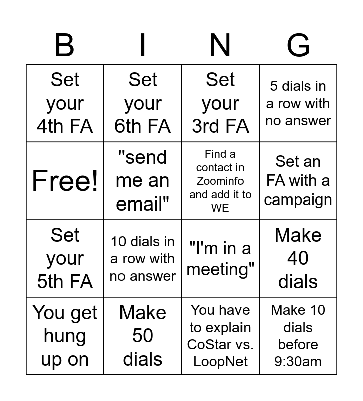 This bingo card has 16 words: Make 50 dials, Make 40 dials, Set your 3rd FA, Set your 4th FA, Set your 5th FA, Set your 6th FA, "I'm in a meeting", You have to explain CoStar vs. LoopNet, Free!, "send me an email", You get hung up on, 5 dials in a row with no answer, 10 dials in a row with no answer, Set an FA with a campaign, Find a contact in Zoominfo and add it to WE and Make 10 dials before 9:30am.