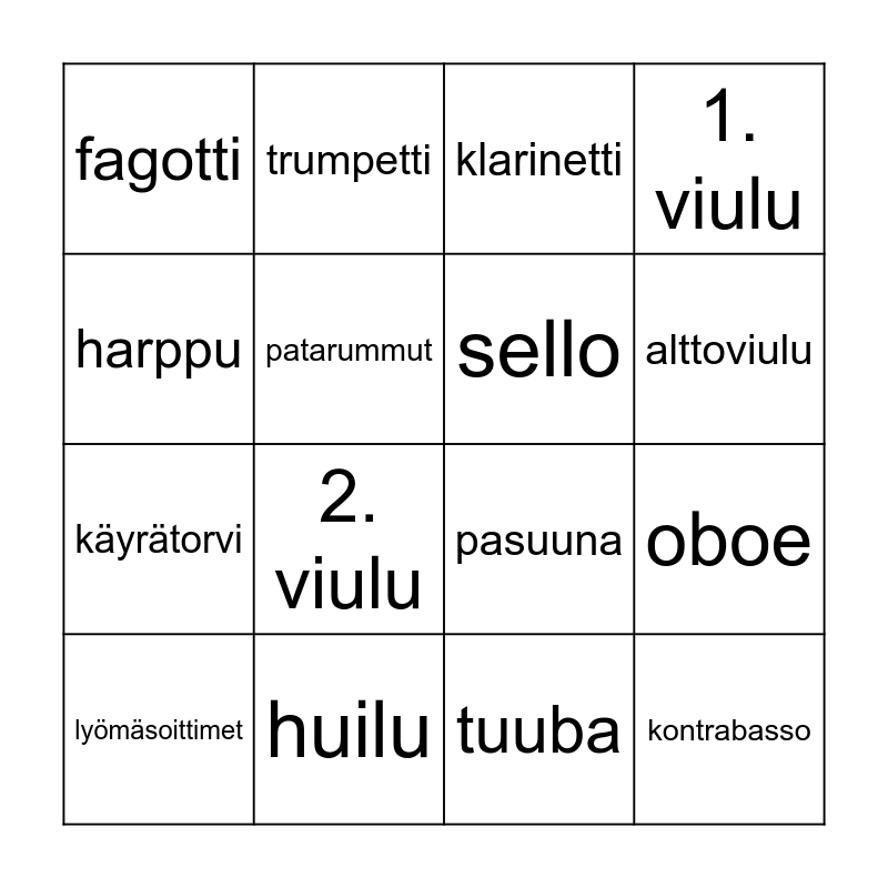This bingo card has 16 words: huilu, oboe, klarinetti, fagotti, käyrätorvi, trumpetti, pasuuna, tuuba, harppu, patarummut, lyömäsoittimet, 1. viulu, 2. viulu, alttoviulu, sello and kontrabasso.